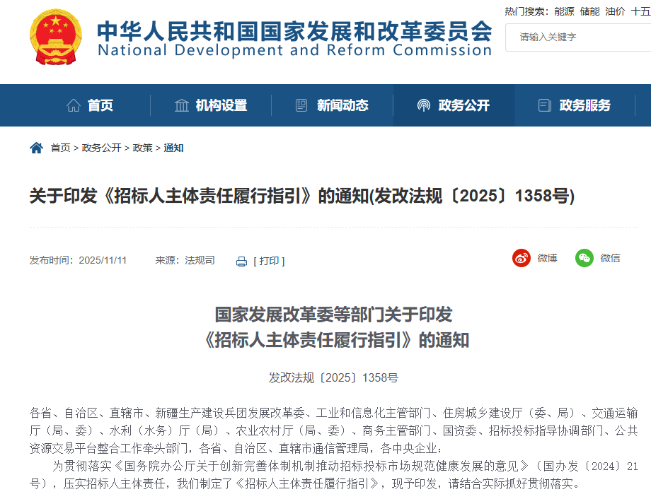 國家發展改革委等部門印發《招標人主體責任履行指引》(發改法規〔2025〕1358號)